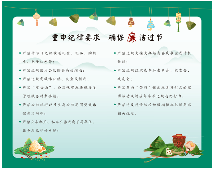 定制廉潔提醒卡。端午廉潔提醒卡內(nèi)容經(jīng)過精選,融合廉潔提醒、“十個嚴(yán)禁”、端午詩詞鑒賞等內(nèi)容,在品味端午文化的同時,為全體黨員干部職工擰緊紀(jì)律“發(fā)條”,確保風(fēng)清氣正過端午。